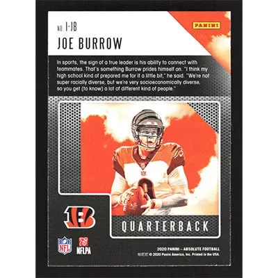 This is a 2020 Absolute Introductions Joe Burrow football card. The card is #I-JB and pictures show condition. Team(s): Cincinnati Bengals Rookie Card (RC)