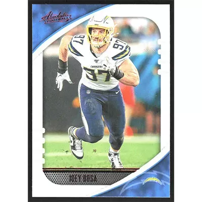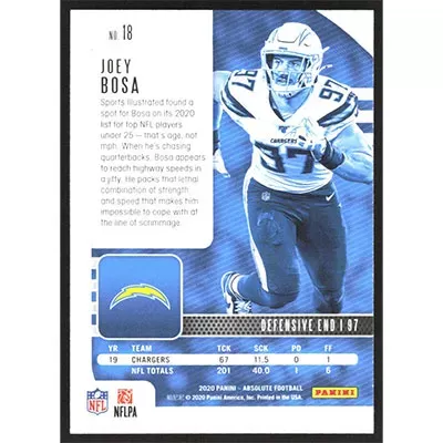 This is a 2020 Absolute Red Joey Bosa football card. The card is #18 and pictures show condition.