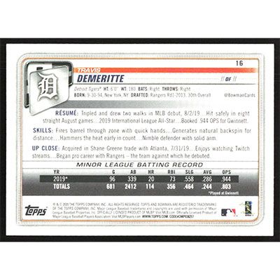 This is a 2020 Bowman Travis Demeritte baseball card. The card is #16 and pictures show condition.