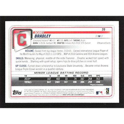 This is a 2020 Bowman Bobby Bradley baseball card. The card is #20 and pictures show condition.