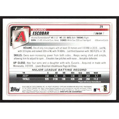 This is a 2020 Bowman Eduardo Escobar baseball card. The card is #29 and pictures show condition.
