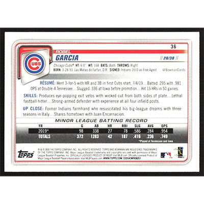 This is a 2020 Bowman Robel Garcia baseball card. The card is #36 and pictures show condition.