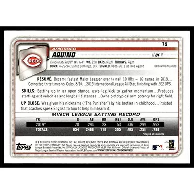 This is a 2020 Bowman Aristides Aquino baseball card. The card is #79 and pictures show condition.