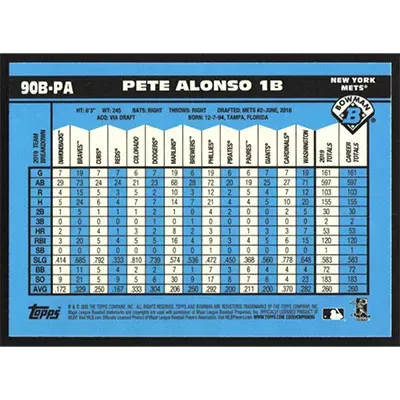 This is a 2020 Bowman '90 Pete Alonso baseball card. The card is #90B-PA and pictures show condition.