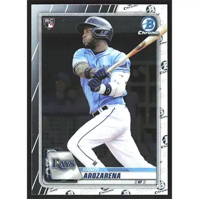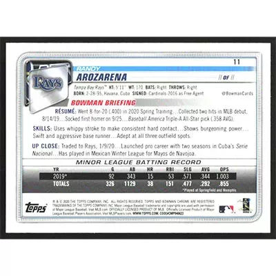 This is a 2020 Bowman Chrome Randy Arozarena baseball card. The card is #11 and pictures show condition.
