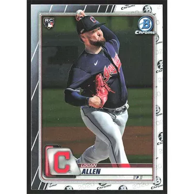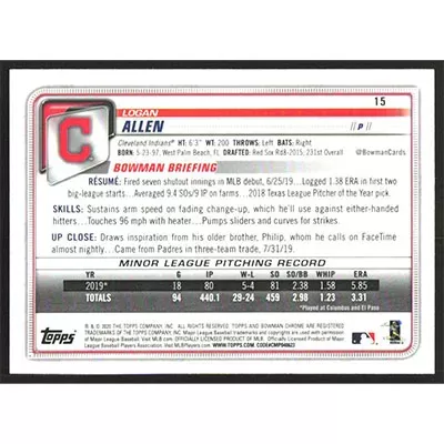 This is a 2020 Bowman Chrome Logan Allen baseball card. The card is #15 and pictures show condition.