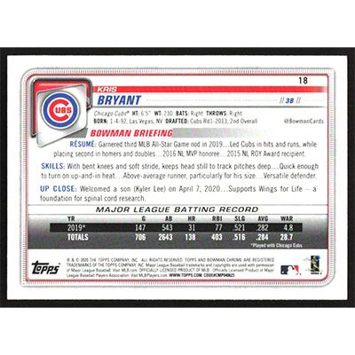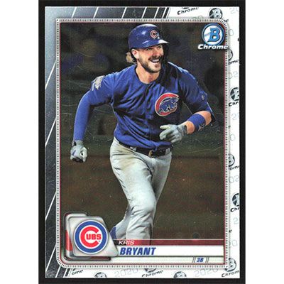 This is a 2020 Bowman Chrome Kris Bryant baseball card. The card is #18 and pictures show condition.
