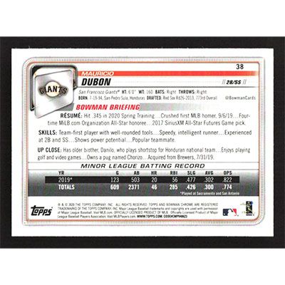 This is a 2020 Bowman Chrome Mauricio Dubon baseball card. The card is #38 and pictures show condition. Team(s): San Francisco Giants Rookie Card (RC)