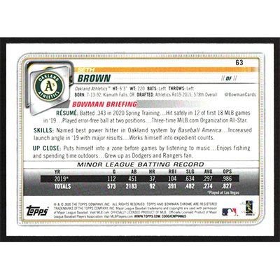 This is a 2020 Bowman Chrome Seth Brown baseball card. The card is #63 and pictures show condition.