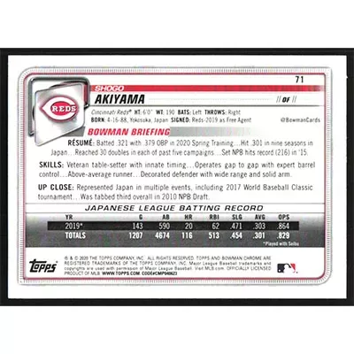 This is a 2020 Bowman Chrome Shogo Akiyama baseball card. The card is #71 and pictures show condition.