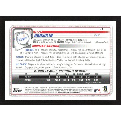 This is a 2020 Bowman Chrome Tony Gonsolin baseball card. The card is #74 and pictures show condition. Team(s): Los Angeles Dodgers Rookie Card (RC)