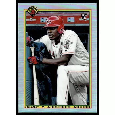 This is a 2020 Bowman Chrome '90 Aristides Aquino baseball card. The card is #90B-AA and pictures show condition. Team(s): Cincinnati Reds Rookie Card (RC)