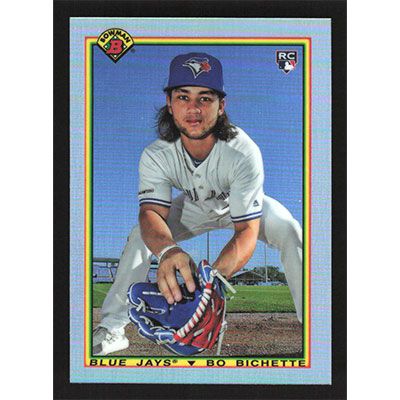This is a 2020 Bowman Chrome '90 Bo Bichette baseball card. The card is #90B-BB and pictures show condition. Team(s): Toronto Blue Jays Rookie Card (RC)