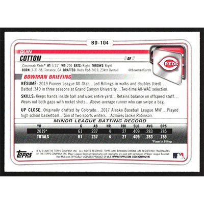 This is a 2020 Bowman Chrome Draft Quin Cotton baseball card. The card is #BD-104 and pictures show condition.