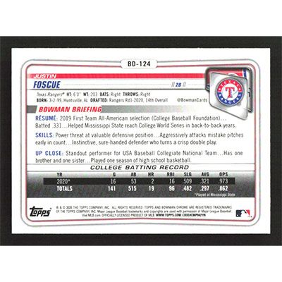 This is a 2020 Bowman Chrome Draft Justin Foscue baseball card. The card is #BD-124 and pictures show condition.