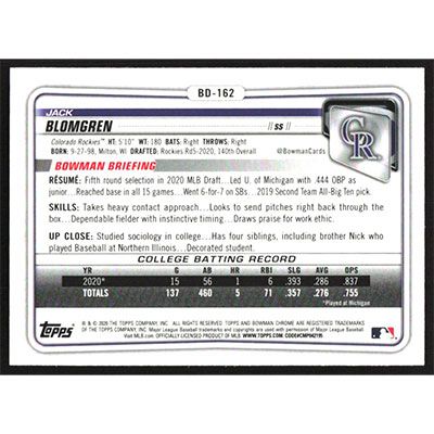 This is a 2020 Bowman Chrome Draft Jack Blomgren baseball card. The card is #BD-162 and pictures show condition.