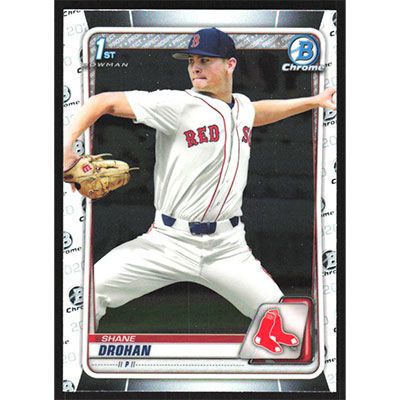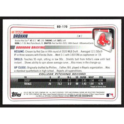 This is a 2020 Bowman Chrome Draft Shane Drohan baseball card. The card is #BD-170 and pictures show condition.