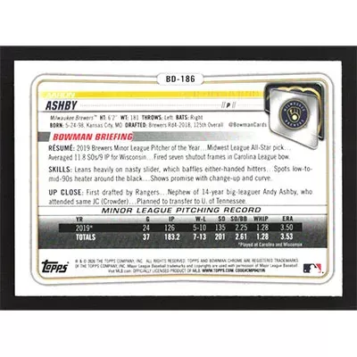 This is a 2020 Bowman Chrome Draft Aaron Ashby baseball card. The card is #BD-186 and pictures show condition.