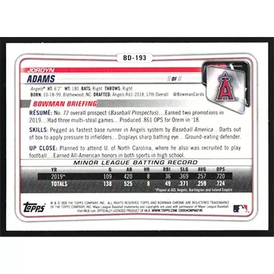 This is a 2020 Bowman Chrome Draft Jordyn Adams baseball card. The card is #BD-193 and pictures show condition.