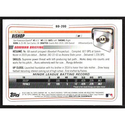 This is a 2020 Bowman Chrome Draft Hunter Bishop baseball card. The card is #BD-200 and pictures show condition.