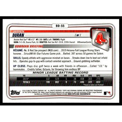 This is a 2020 Bowman Chrome Draft Jarren Duran baseball card. The card is #BD-55 and pictures show condition.