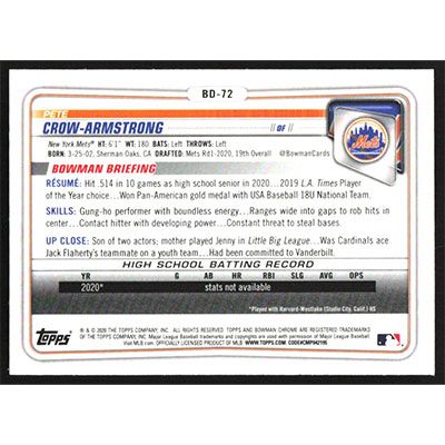 This is a 2020 Bowman Chrome Draft Pete Crow-Armstrong baseball card. The card is #BD-72 and pictures show condition.