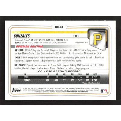 This is a 2020 Bowman Chrome Draft Nick Gonzales baseball card. The card is #BD-81 and pictures show condition.