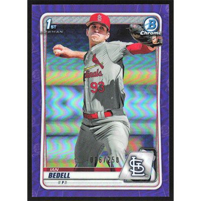 This is a 2020 Bowman Chrome Draft Purple Refractors Ian Bedell baseball card. The card is #BD-100 and pictures show condition. This card is limited; #'d 016/250.