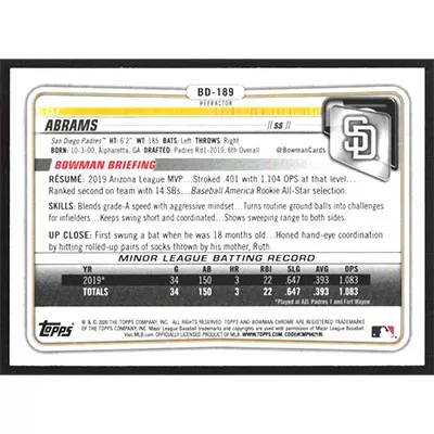 This is a 2020 Bowman Chrome Draft Refractors CJ Abrams baseball card. The card is #BD-189 and pictures show condition.