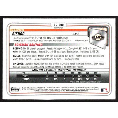 This is a 2020 Bowman Chrome Draft Refractors Hunter Bishop baseball card. The card is #BD-200 and pictures show condition. Team(s): San Francisco Giants