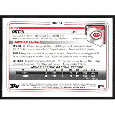 This is a 2020 Bowman Chrome Draft Sapphire Quin Cotton baseball card. The card is #BD-104 and pictures show condition.