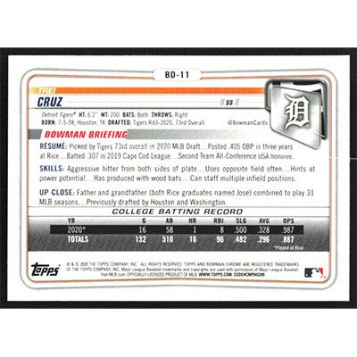 This is a 2020 Bowman Chrome Draft Sapphire Trei Cruz baseball card. The card is #BD-11 and pictures show condition.