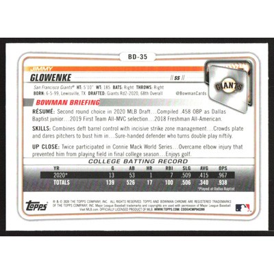 This is a 2020 Bowman Chrome Draft Sapphire Jimmy Glowenke baseball card. The card is #BD-35 and pictures show condition.
