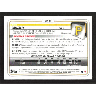 This is a 2020 Bowman Chrome Draft Sapphire Nick Gonzales baseball card. The card is #BD-81 and pictures show condition.
