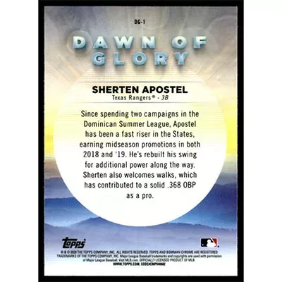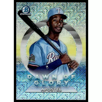 This is a 2020 Bowman Chrome Mega Box Dawn of Glory Refractors Sherten Apostel baseball card. The card is #DG-1 and pictures show condition. Team(s): Texas Rangers
