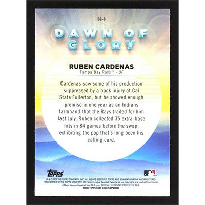 This is a 2020 Bowman Chrome Mega Box Dawn of Glory Refractors Ruben Cardenas baseball card. The card is #DG-9 and pictures show condition. Team(s): Tampa Bay Rays