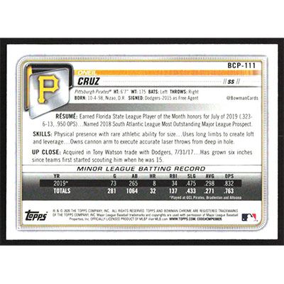 This is a 2020 Bowman Chrome Mega Box Prospects Refractors Oneil Cruz baseball card. The card is #BCP-111 and pictures show condition. Team(s): Pittsburgh Pirates