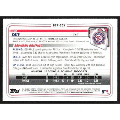 This is a 2020 Bowman Chrome Mega Box Prospects Refractors Tim Cate baseball card. The card is #BCP-205 and pictures show condition. Team(s): Washington Nationals