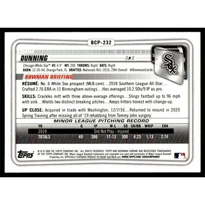 This is a 2020 Bowman Chrome Mega Box Prospects Refractors Dane Dunning baseball card. The card is #BCP-232 and pictures show condition. Team(s): Chicago White Sox