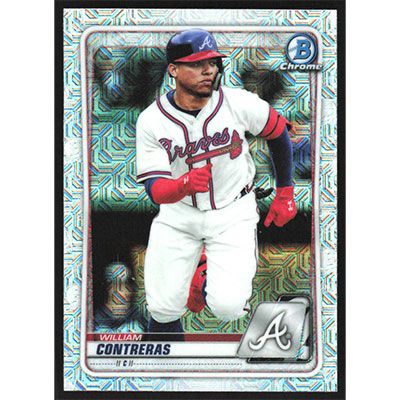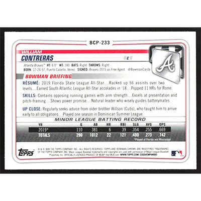 This is a 2020 Bowman Chrome Mega Box Prospects Refractors William Contreras baseball card. The card is #BCP-233 and pictures show condition. Team(s): Atlanta Braves