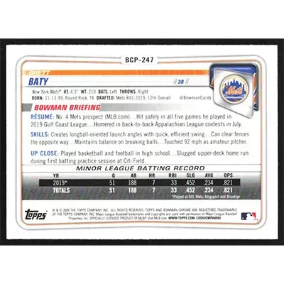 This is a 2020 Bowman Chrome Mega Box Prospects Refractors Brett Baty baseball card. The card is #BCP-247 and pictures show condition. Team(s): New York Mets