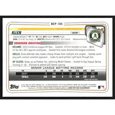 This is a 2020 Bowman Chrome Prospects Nick Allen baseball card. The card is #BCP-105 and pictures show condition.