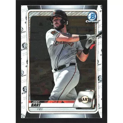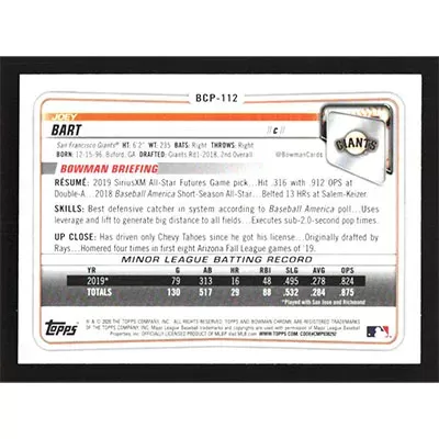 This is a 2020 Bowman Chrome Prospects Joey Bart baseball card. The card is #BCP-112 and pictures show condition.