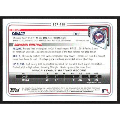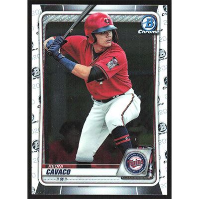 This is a 2020 Bowman Chrome Prospects Keoni Cavaco baseball card. The card is #BCP-118 and pictures show condition.