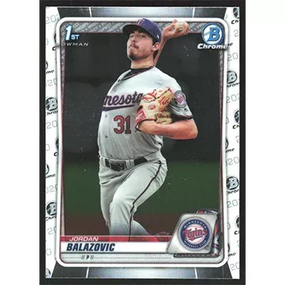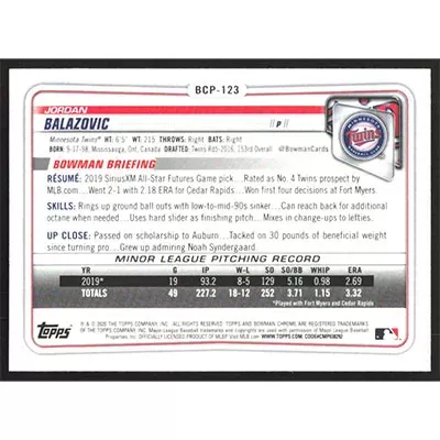 This is a 2020 Bowman Chrome Prospects Jordan Balazovic baseball card. The card is #BCP-123 and pictures show condition.