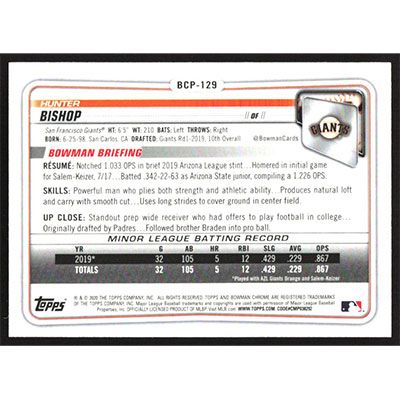 This is a 2020 Bowman Chrome Prospects Hunter Bishop baseball card. The card is #BCP-129 and pictures show condition.