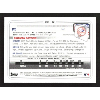 This is a 2020 Bowman Chrome Prospects Luis Gil baseball card. The card is #BCP-132 and pictures show condition.