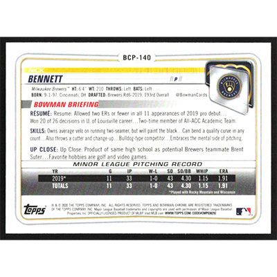This is a 2020 Bowman Chrome Prospects Nick Bennett baseball card. The card is #BCP-140 and pictures show condition.