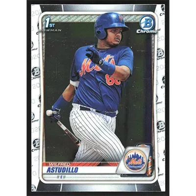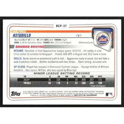 This is a 2020 Bowman Chrome Prospects Wilfred Astudillo baseball card. The card is #BCP-37 and pictures show condition.