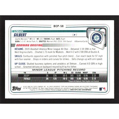 This is a 2020 Bowman Chrome Prospects Logan Gilbert baseball card. The card is #BCP-58 and pictures show condition.